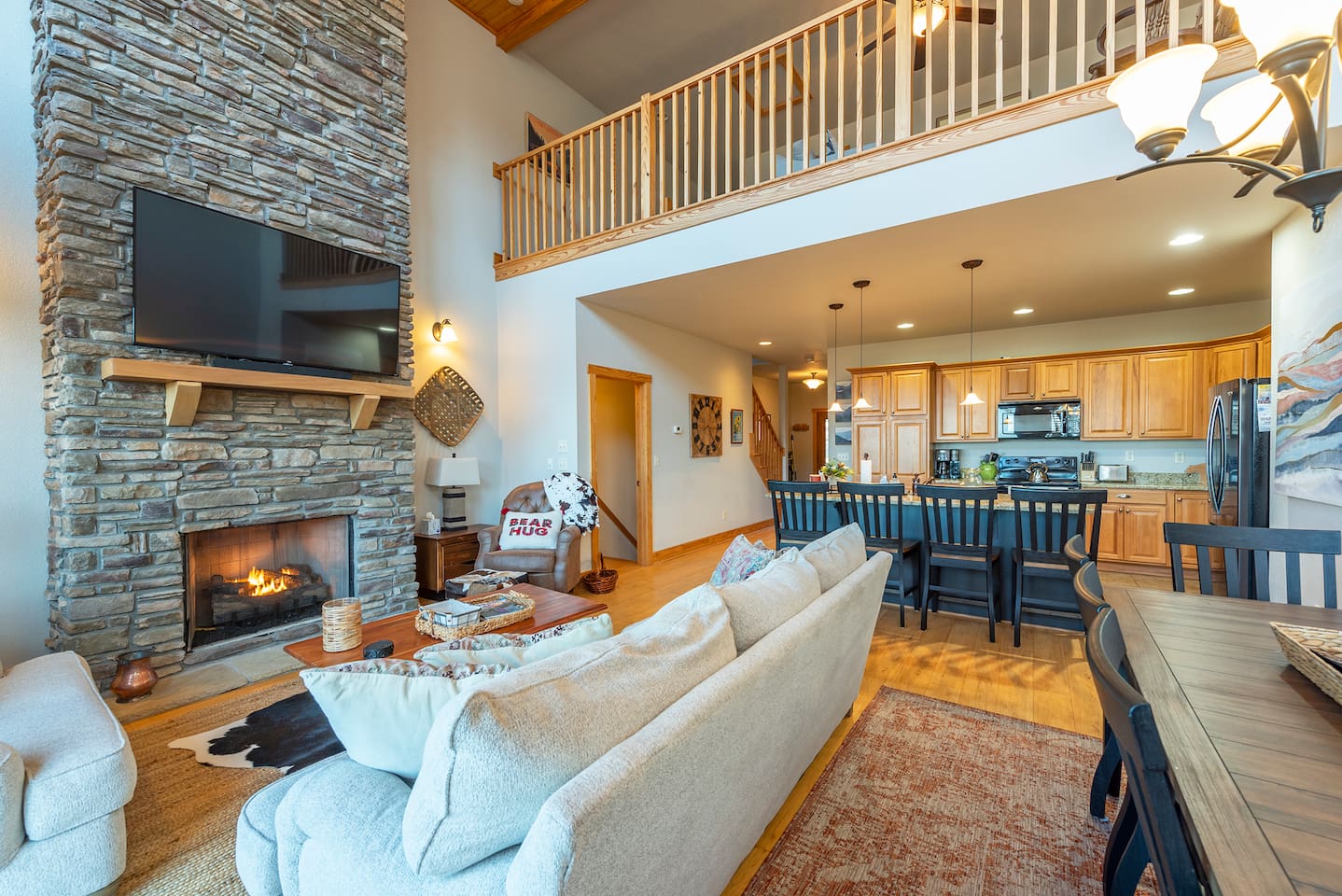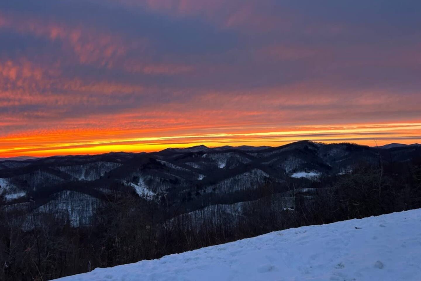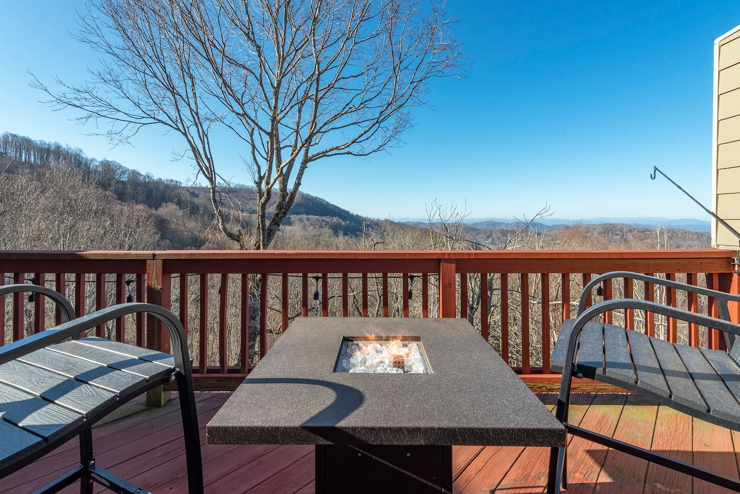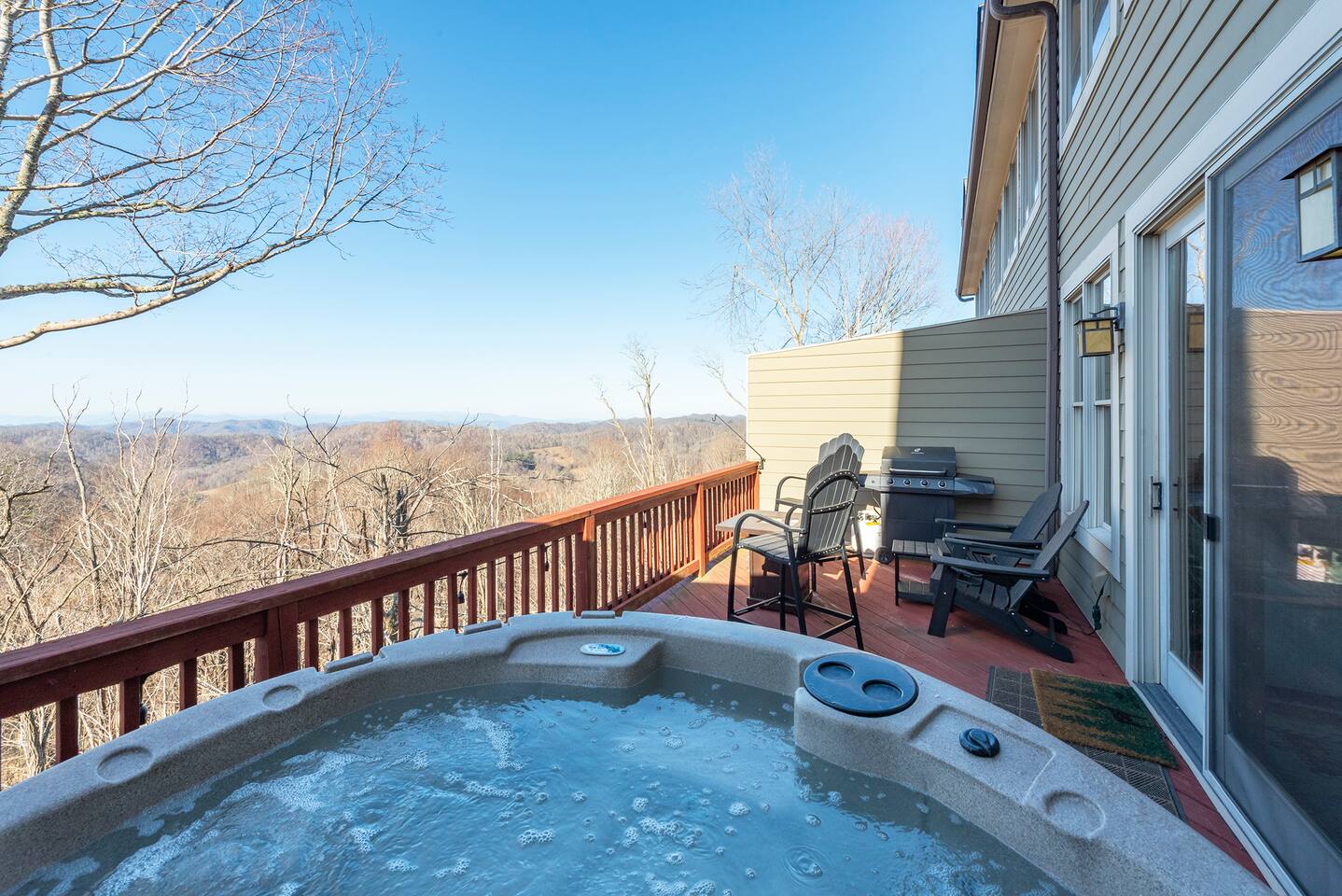 🏔️ 4BR Mountaintop Retreat | Hot Tub • Theater • Games • Near Skiing Escape to our 4BR / 3BA luxury mountaintop haven at 4,200+ feet, where sweeping Blue Ridge Mountain views steal the show year-round. In fall, the mountains glow in fiery reds and golds. In winter, snowflakes drift past twinkling lights as ski season comes alive at Hatley Pointe Ski Resort—just 5 minutes away. Whether you’re soaking in the hot tub under the stars, cozying up by the stone fireplace, or hosting epic movie nights, this spacious retreat is built for unforgettable mountain memories. 🛏️ Sleeping Arrangements (Comfort for Everyone) Top-Floor Primary Suite King bed Private balcony with panoramic mountain views En-suite bathroom Smart TV Main-Floor Queen Bedroom Queen bed with Smart TV Option for private bathroom via hallway door Lower-Level Bunk Haven Queen bed + full/twin bunk beds Private bathroom Smart TV Private deck—perfect for stargazing Additional Private Bunk Room Ideal for kids or extra guests Loft Retreat Cozy reading/lounge area Stunning two-story mountain views Great remote-work escape 🎬 Movie Room + Game Night Central Head downstairs for nonstop fun: Home theater with immersive viewing Foosball table Golden Tee arcade machine Bar top for cocktails or mocktails Board games for cozy evenings 🔥 Inviting Living Space Two-story windows framing mountain sunsets and snowy peaks Towering stone gas fireplace Large Smart TV Expansive deck with: Hot tub Gas fire pit Crisp mountain air and star-filled skies 🍽️ Gourmet Kitchen & Dining Cook and gather with ease in the fully equipped kitchen: Spacious island seating Massive dining table for group meals Everything you need for hearty stews, holiday feasts, or mulled cider nights 🌲 Location Highlights Leaf-peeping hikes, ziplining, and trout fishing nearby Hatley Pointe Ski Resort – 5 minutes away Easy access to: Asheville Weaverville Mars Hill Wolf Provisions General Store (5 min): coffee, hot meals, ice cream, essentials Scenic drives along the Blue Ridge Parkway Bristol Motor Speedway ~1 hour away 🚗 Important Travel Notes 4WD recommended during snow or icy conditions Secure trash in locked bins to deter wildlife ✨ Book now for a luxurious mountain escape filled with views, comfort, and fun—perfect for fall foliage, winter adventures, and holiday gatherings